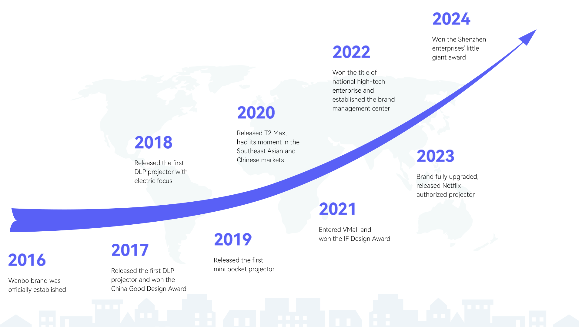 As of 2024, Wanbo has won more than 25 international awards. Wanbo continues to invest in R&D, has won more than 62 patents, and has pioneered many leading technologies in the field of smart projection.