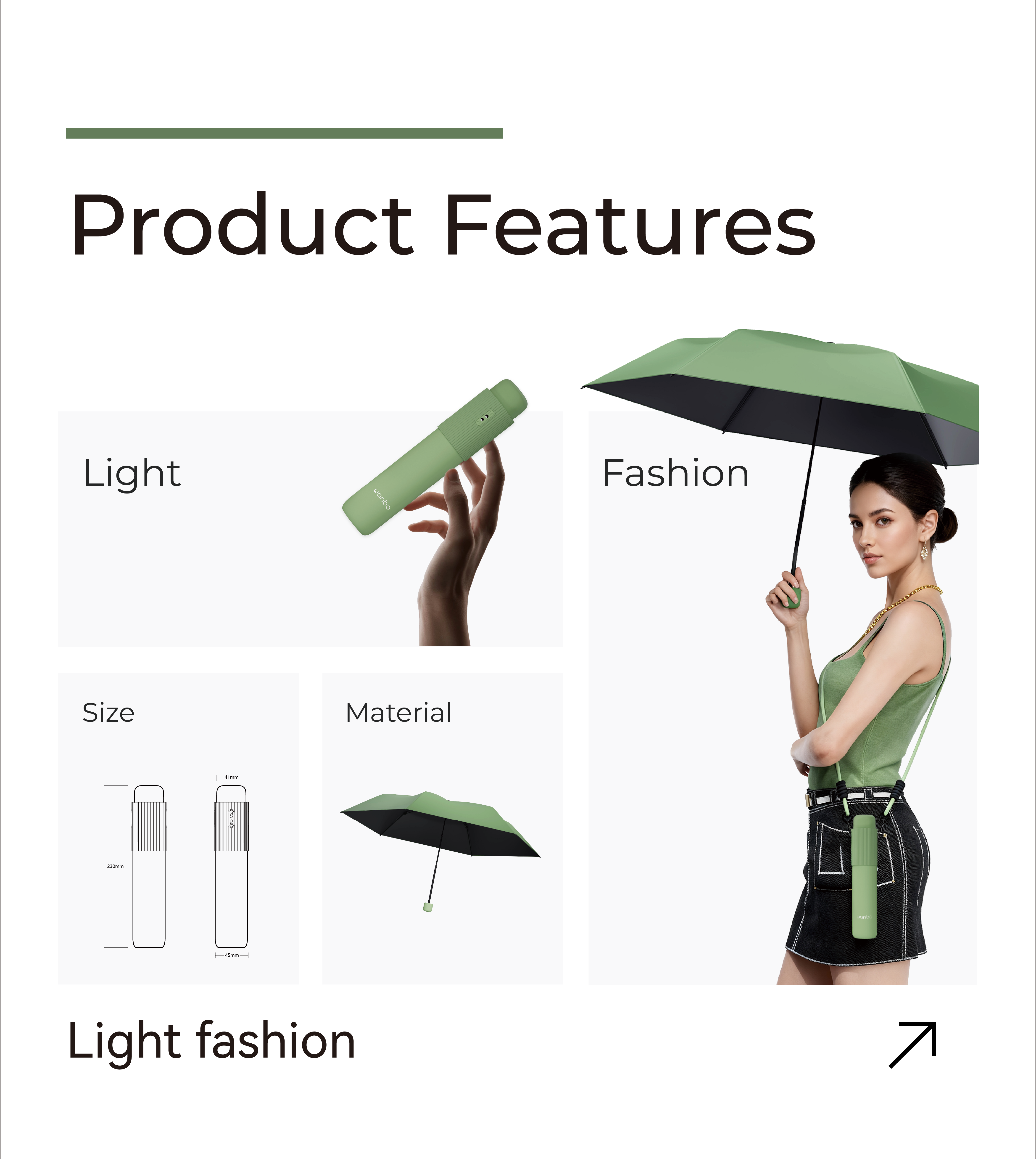 • 6-rib black aluminum frame — lightweight yet sturdy